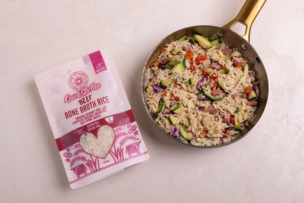 Elevate your meals with Quick Stix Bone Broth Rice Mix! Organic Basmati rice combined with certified organic, collagen and protein-rich beef bone broth - just add water and cook for a nourishing, gut-loving meal in minutes.