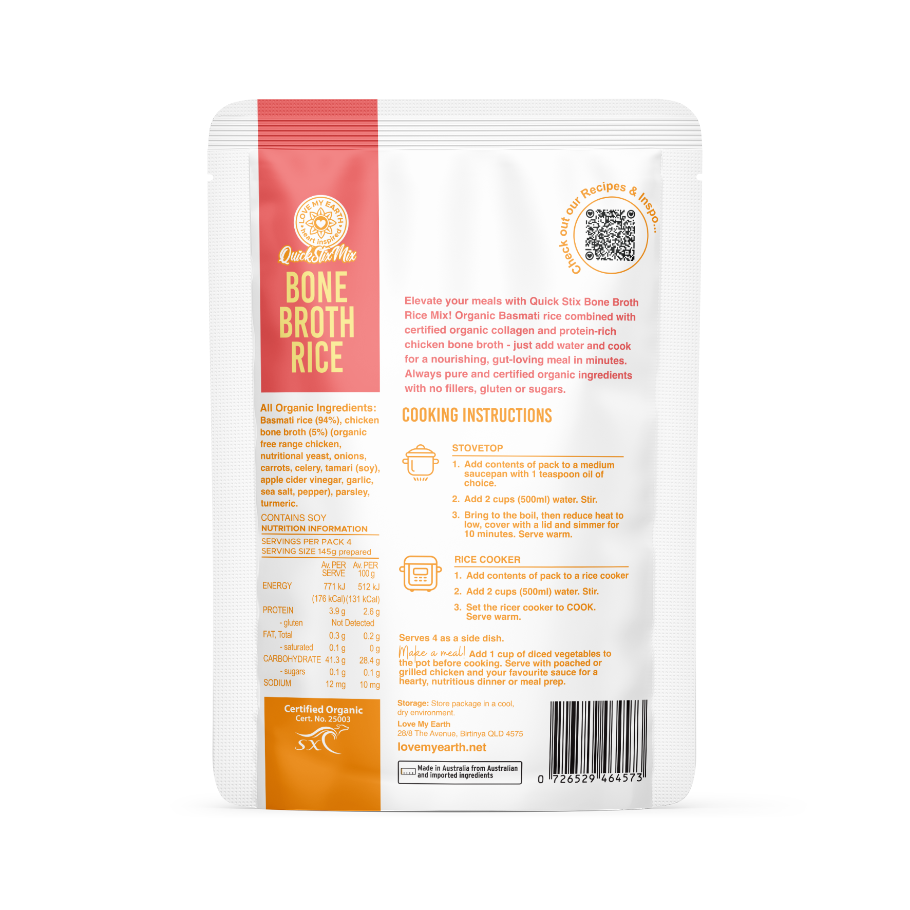 Elevate your meals with Quick Stix Bone Broth Rice Mix! Organic Basmati rice combined with certified organic, collagen and protein-rich chicken bone broth - just add water and cook for a nourishing, gut-loving meal in minutes.
